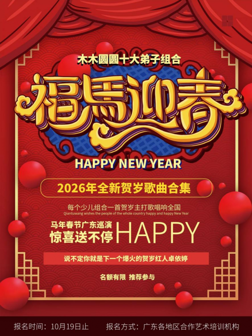 届时,飞越木木携手歌舞全能女艺人“圆圆”共同打造的“木木圆圆”十大弟子组合也将推荐参加2026年少儿贺岁歌曲合集《福马迎春》全国发行,并特邀公益形象大使“星仔”开启全新的广东地区闹新春巡演互动。