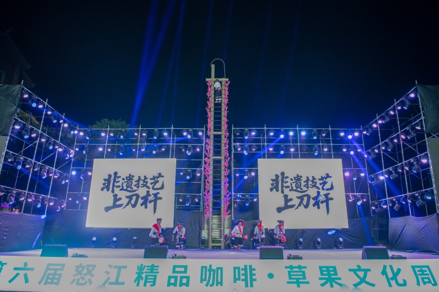 晚会在《歌唱幸福好时光》的悠扬民歌中拉开序幕,随后惊险刺激的“上刀杆”展演瞬间点燃现场气氛,展现了泸水民间艺术的独特魅力。整场演出以“峡谷春醒 金果萌新”“浓荫炽夏 银果凝香”“层林尽染 硕果丰实”三个篇章,串联起怒江与草果、咖啡的四季故事。12个节目涵盖舞蹈、歌伴舞、组合演唱等多种形式,由泸水市民族文化工作队、怒江州民族文化工作团等团队精彩呈现,生动诠释了泸水这片土地上人民的奋斗与收获,描绘出了一幅产业兴、百姓富、生态美的动人画卷。